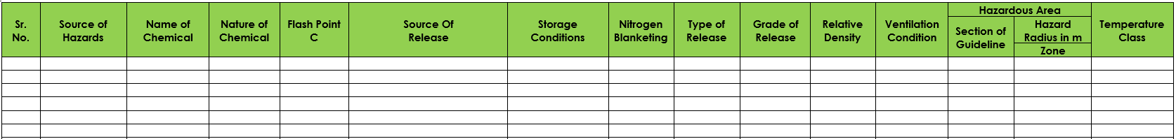All flammable gases and vapours handled, processed, or stored within the facility are identified. Their physical and chemical properties such as flash point, boiling point, vapour density, lower and upper explosive limits, and auto-ignition temperature are reviewed to assess their hazardous characteristics.
