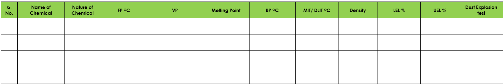 All flammable gases and vapours handled, processed, or stored within the facility are identified. Their physical and chemical properties such as flash point, boiling point, vapour density, lower and upper explosive limits, and auto-ignition temperature are reviewed to assess their hazardous characteristics.
