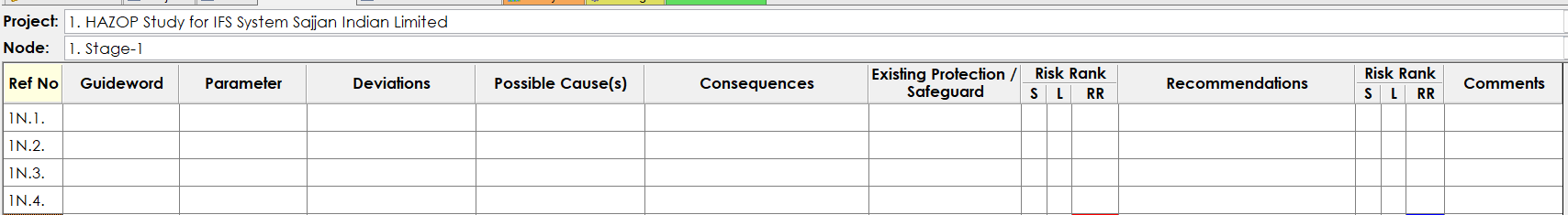 - Detailed description of Nodes, Deviation, Cause, Consequences, Safeguards and Recommendations